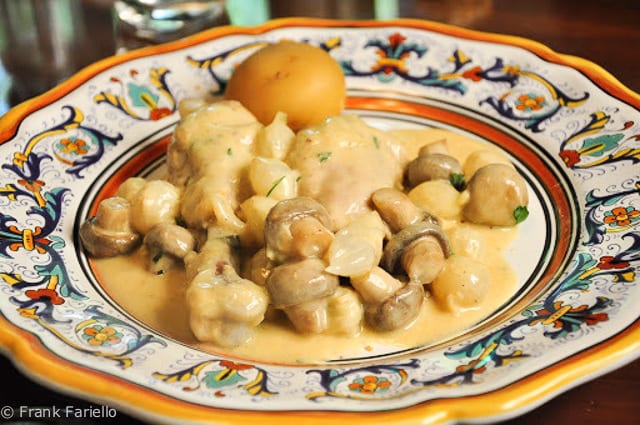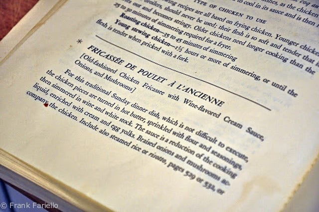 I grew up on Julia Child. Other than nonna Angelina herself, no one inspired my love affair with cooking more. While other kids were eating milk and cookies and watching cartoons, I ran home to make rice and cheese and sit down to the latest instalment of The French Chef. And I practically memorized my Mom’s original 1963 edition of Mastering the Art of French Cooking while I was still a teenager living at home. So when I saw Julie and Julia with my folks, I broke out my own well-worn, dog-eared, nearly-falling-apart-at-the-seams 1986 edition, purchased when I was living in New York after law school, and starting reacquainting myself with an old friend. But the dish I was yearning for was not boeuf bourguignon. As much as I love that dish, my favorite dishes from Mastering were the chicken fricassées. And this is one is perhaps the most sumptuous of all—fit for a lovely Sunday dinner: fricassée de volaille à l’ancienne, or “Old Fashioned Chicken Fricassee with Wine-Flavored Cream Sauce, Onions and Mushrooms”, on page 258.