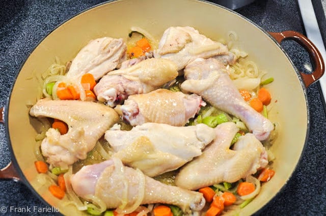 Step 2: Push the vegetables to the sides of the dish and add a frying chicken that has been cut up into pieces. Raise the heat to medium and turn the chicken pieces often until they have stiffened slightly without coloring more than a light golden yellow—about 3-4 minutes. Lower the heat and cover the braiser and cook the chicken very slowly for 10 minutes, turning the pieces once. The chicken should swell slightly and stiffen a bit further, but it should not brown: