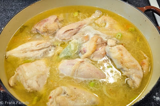 Step 4: Then add enough hot chicken stock to almost cover the chicken pieces, then enough white wine to just cover the pieces. Insert an herb bouquet of parsley, fresh thyme and half a bay leaf inside a small cheesecloth ‘bag’. Cover and simmer for 25-30 minutes: