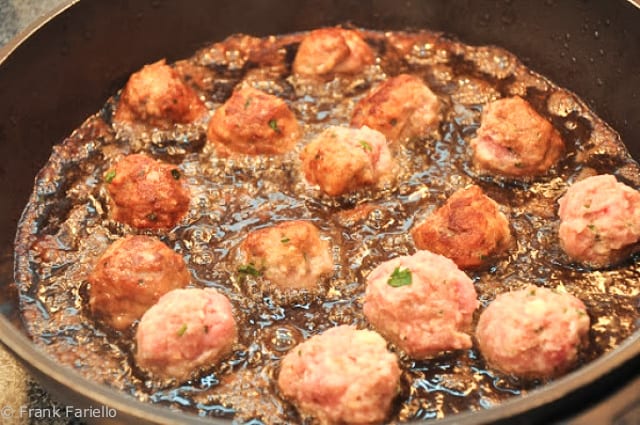 The meatballs are an important part of this dish. There are a few keys to making good meatballs. First, make sure that the mixture is well seasoned and, in particular, don’t skim on the salt or the cheese (be it parmesan or pecorino). Second, use enough, but not too much, milk-soaked bread (or breadcrumbs) as ‘filler’, so that the texture is not too soft or not too hard. (The more filler you use, the softer the meatballs will be.) Third, make sure that you shallow fry the meatballs in light olive oil (or vegetable oil) over moderate heat, so they neither cook too quickly—the bread content will mean they brown quickly and could burn—nor too slowly, giving in a dry, greasy result. The oil should bubble up gently around the meatballs when you place them in the oil (see picture below). To be sure that your mixture is properly seasoned and has the right texture, it is a good idea to form one meatball, fry it up and taste it. If it passes your taste test, proceed. If not, adjust seasoning or filler content.