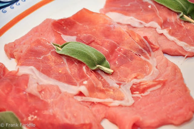 - You begin with slices of veal known as scallopine. Trim off any loose meat or connective tissue and pound them very thin between two sheets of wax paper (or plastic wrap), then lay a thin slice of prosciutto and a single sage leaf over each slice of veal. Skewer them all together with a wooden toothpick.