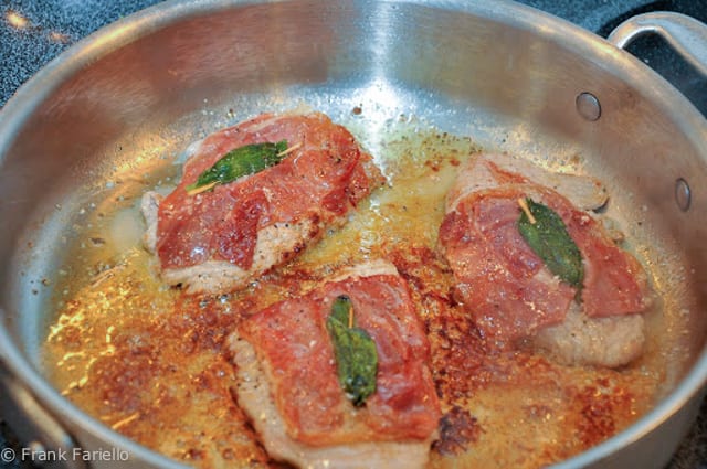 Heat a skillet or sauté pan large enough to hold all your veal slices comfortably. Add a bit of olive oil and butter. When the butter melts, add your veal slices, with the prosciutto and sage side facing down. Allow it to brown for just a minute. (NB: The prosciutto will harden if it fries too long.)