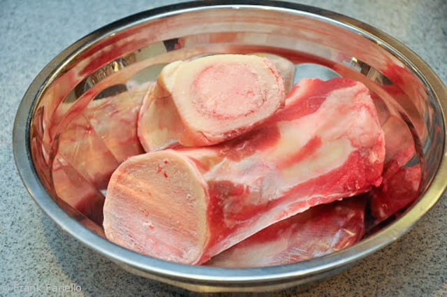 To prepare bone marrow for use in risotto, I like to simmer the marrow bones for just a minute or two to loosen the marrow a bit. Then, using a small spoon or knife, scrape out the marrow from the bone. Depending on how long you’ve simmered the bone, the marrow may also just slip out on its own.