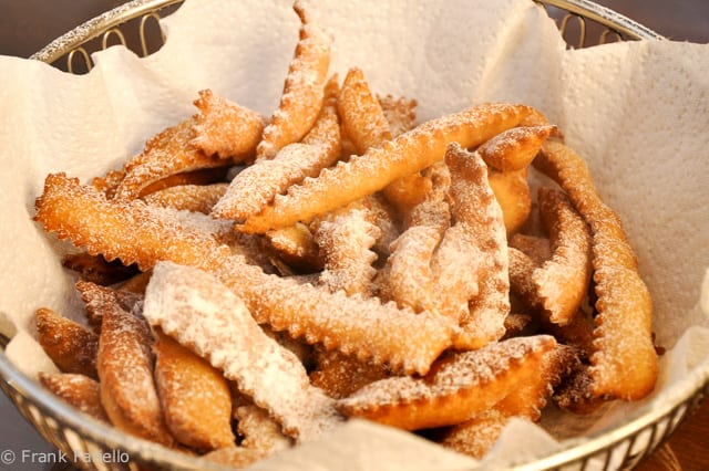 I wasn’t much on sweets even as a kid, but these little sugar-dusted ribbons of fried dough—variously known as chiacchiere, nastrini, stracci, cenci, frappe and a myriad of other names—were my one weakness in the sweets department. They are a traditional treat for Carnival, a time for over-indulgence, culinary and otherwise, getting in your ‘last licks’ before the privations of Lent.