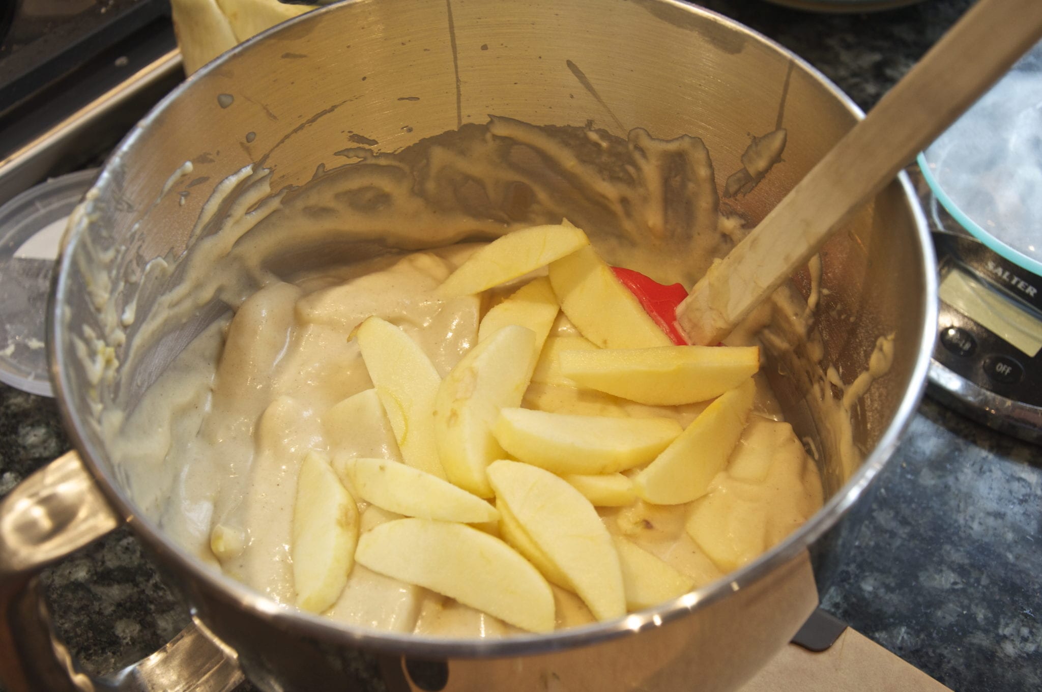- Peel and core the apples, one by one, and slice them into thin wedges. Add the sliced apples to the mixing bowl as you go, folding them into the batter.