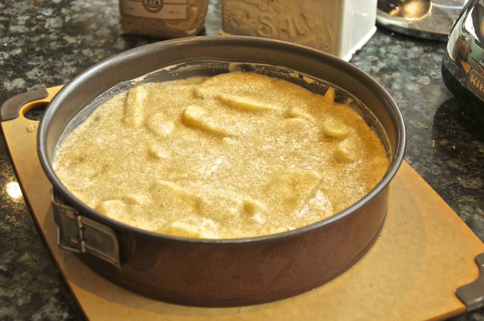 - Pour the apple batter into a springform baking pan, which you will have greased very generously with butter. Even out the top with a spatula and clean off the sides. Sprinkle the top with granulated sugar.