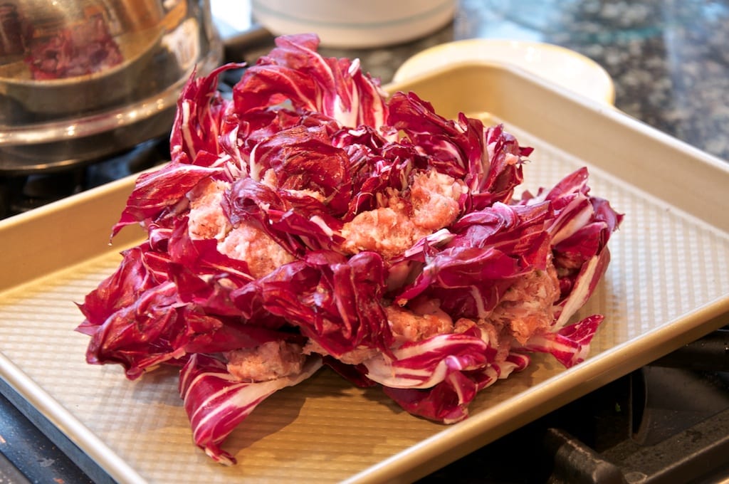 - Squeeze the sausage meat of its casings and, as you go, slip bits here and there among the leaves, pushing the meat down well into the radicchio so it stays in place. Continue until all of the leaves have at least a bit of sausage and the sausage has been used up. Lay the radicchio on a cookie sheet or baking pan. You should wind up with something like this:
