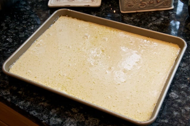 - Now pour the batter into a greased baking sheet. It should just cover the bottom by no more than 2 or 3 cm (1/2 inch) at most, thinner if you like. Sprinkle one of more of the optional flavorings, if you like.