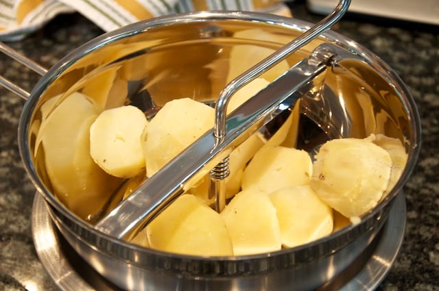 - Peel the potatoes and cut them halves or quarters and pass them through a food mill or potato ricer.