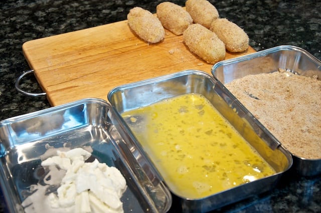 Now set up yourself up with plates full of egg and breadcrumbs, plus your filling if using (today, I used mozzarella). Take a piece of the dough, about the size of ping pong ball, in your hands, and flattened it into an oval shape in the palm of your hand. If you are using a filling, press the filling into the center and close the dough around the filling and then roll it around with your hands to form a lozenge-shaped croquette. If not using the filling, just form the dough into croquettes.
