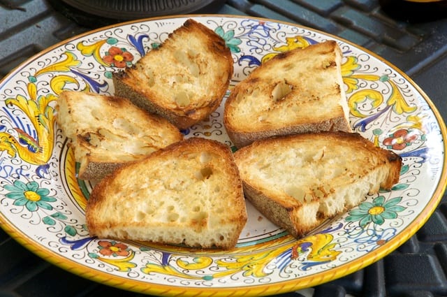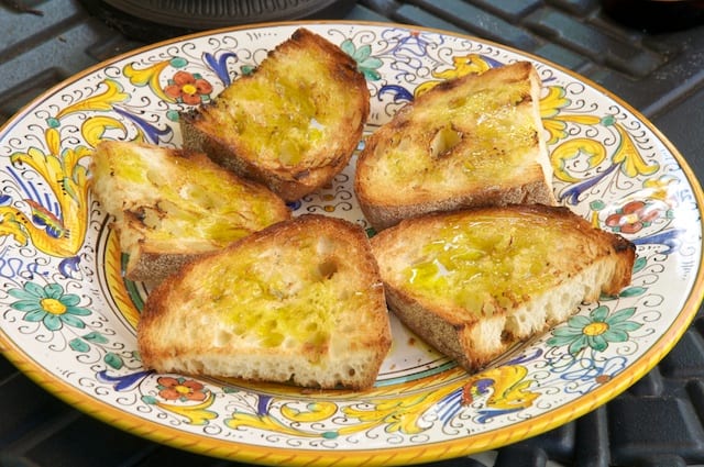 Grill the bread slices over a moderately hot fire until they are nicely toasted on both sides, turning frequently to ensure even browning. Be careful not to burn them; they will cook in only a few minutes.