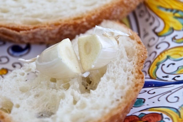 Rub each slice of bread while it is still hot with the exposed inside of the clove, squeezing the garlic between your fingers to release its juices into the bread.