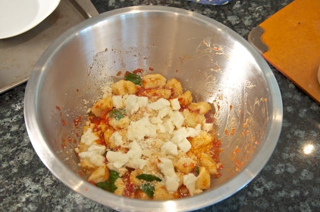- Cook the gnocchi and transfer them to a large bowl. Add about 3/4 of the tomato sauce, 1/2 the mozzarella and a sprinkling of grated cheese and mix gently with a spatula, taking care not to damage the delicate gnocchi.