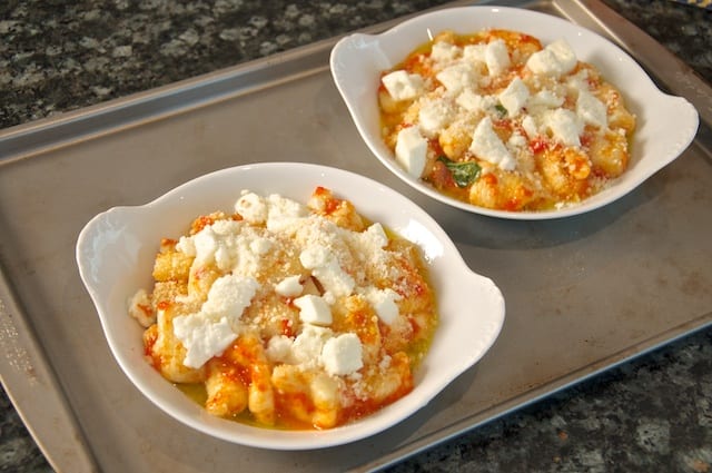 Place in a very hot (220C/450F) oven just until the mozzarella has melted and the gnocchi are bubbling hot. Remove from the oven and let cool for a few minutes before serving.