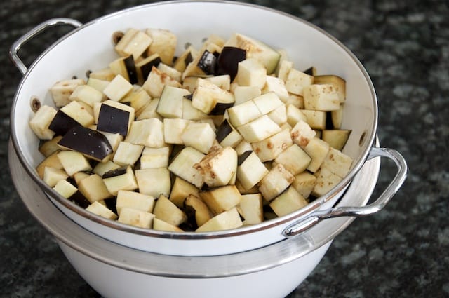Cut the eggplants into good-sized chunks. Toss them into a colander as you go, sprinkling them generous with salt. When you’re all done. let them sit in the colander for a good 30 minutes or more.