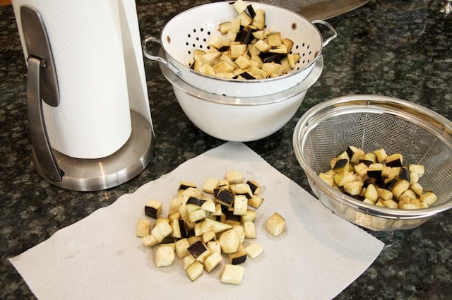 - Now set yourself up with lots of paper towels at the ready, and another colander or bowl. Take whole handfuls of the salted eggplant, lay it on a paper towel, then wrap up the eggplant chunks and gently squeeze to dry them as completely as possible. Drop the dried eggplant into the second colander. Repeat this procedure until you have used up all the eggplant.