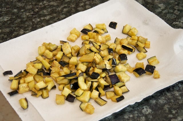 For this dish, you proceed to fry the eggplant chunks in abundant oil until they are just lightly brown around the edges. The eggplant should be tender, but not meltingly so. Lay the fried eggplant out on a baking sheet lined with paper towels to absorb any excess oil.