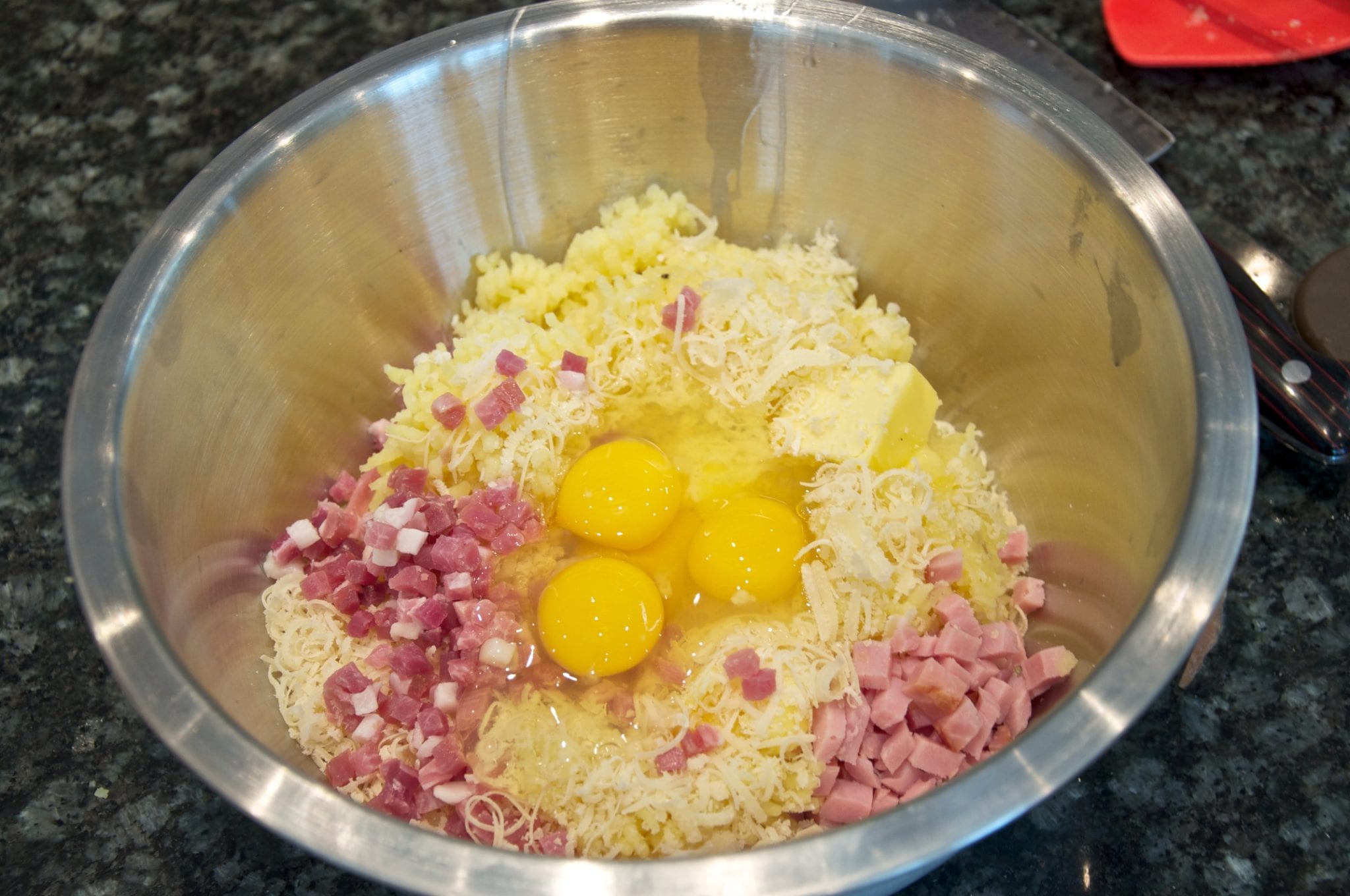 Steam (or boil) the potatoes until they are fully tender, about 20-30 minutes depending on the size and quality of the potato. As soon as they are cool enough to handle, peel the potatoes and run them through a food mill or potato ricer into a large bowl, as if you were making mashed potatoes. Add the butter, grated cheese, seasonings and whole eggs. You can also add, as pictured, the cured meats to this mixture.