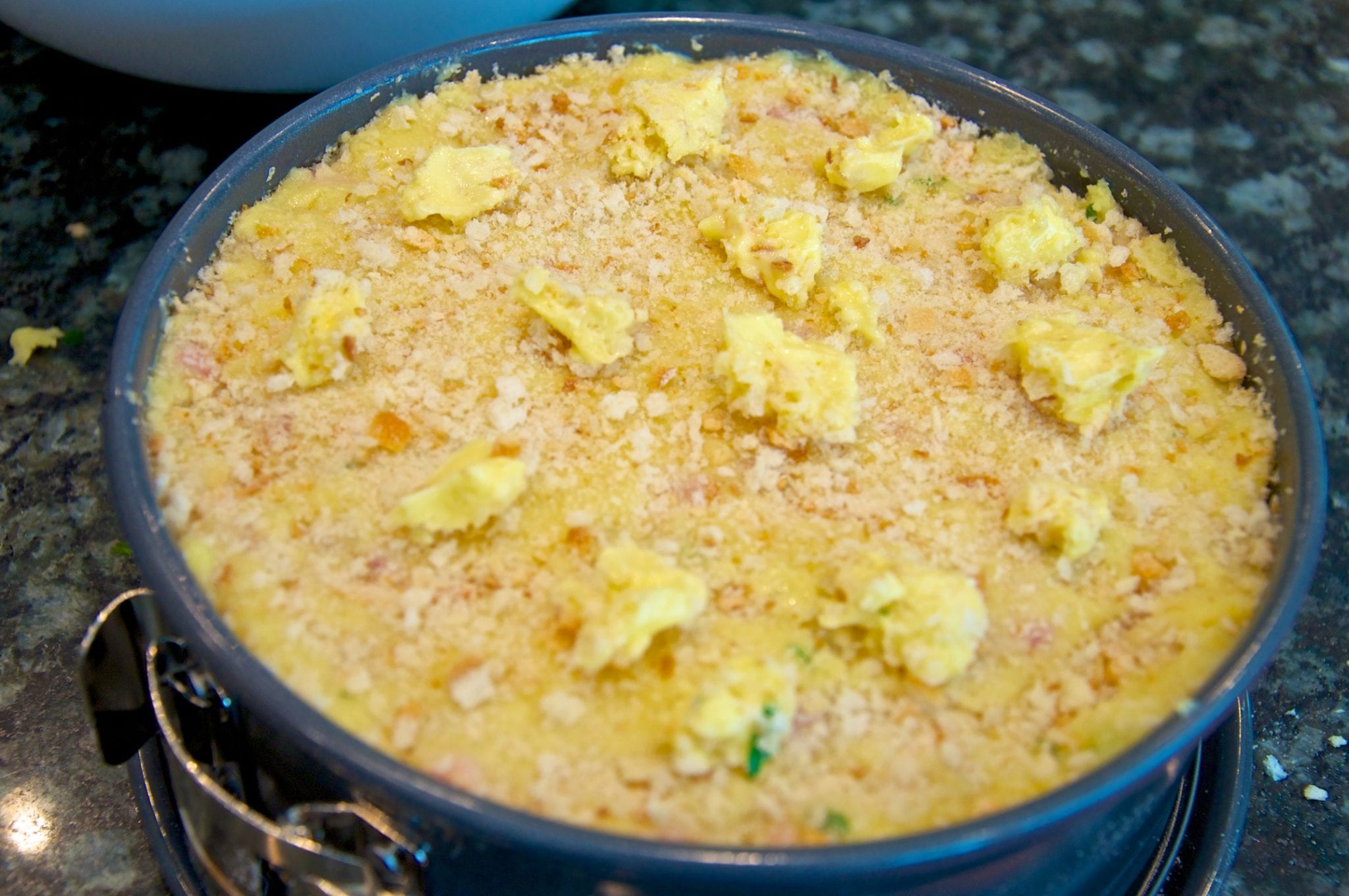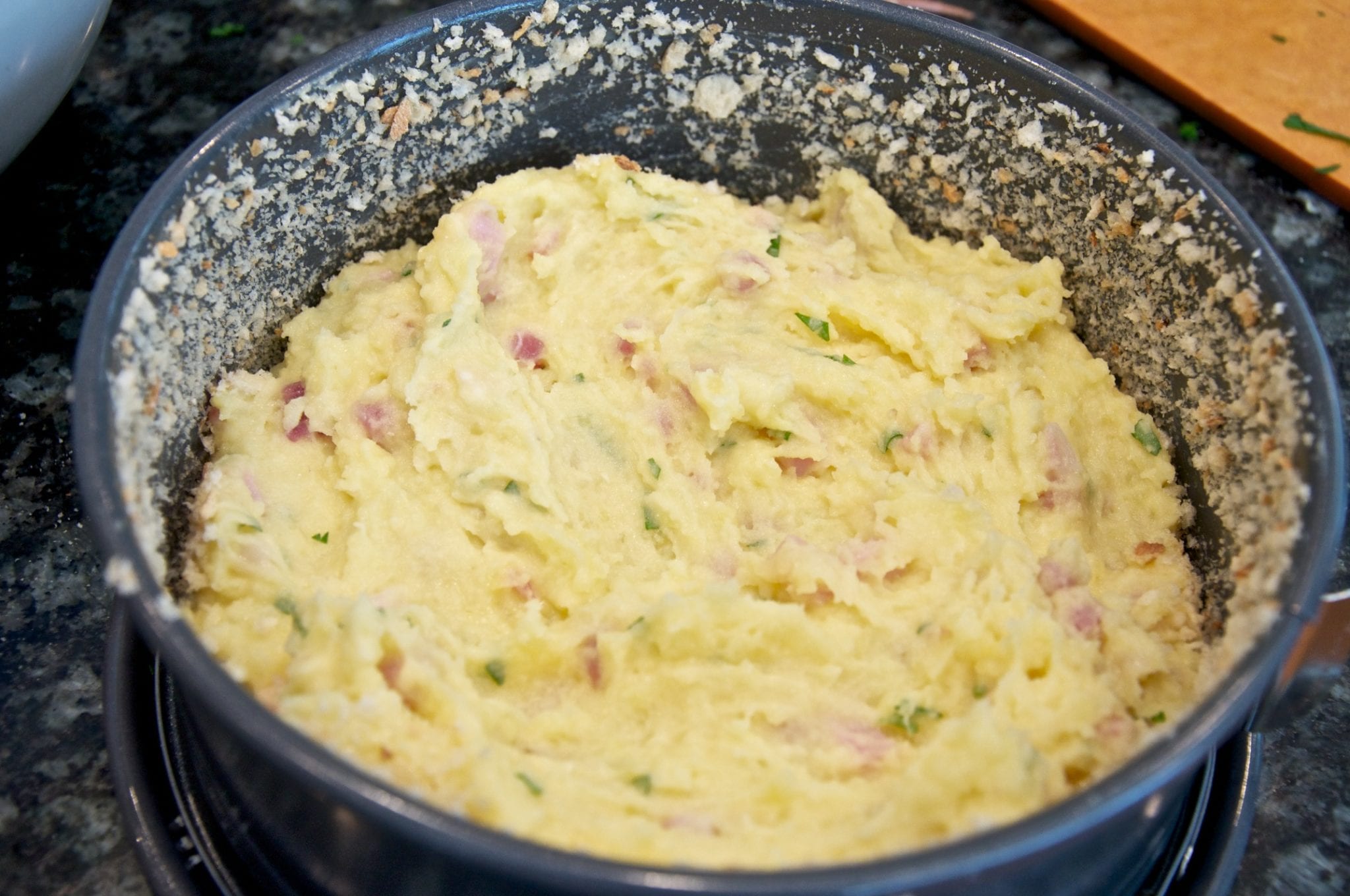 - Add the other half of the mashed potato mixture on top of the filling and even it out so that the surface is nice and flat. Top the whole thing with more breadcrumbs and a few nobs of butter here and there.
