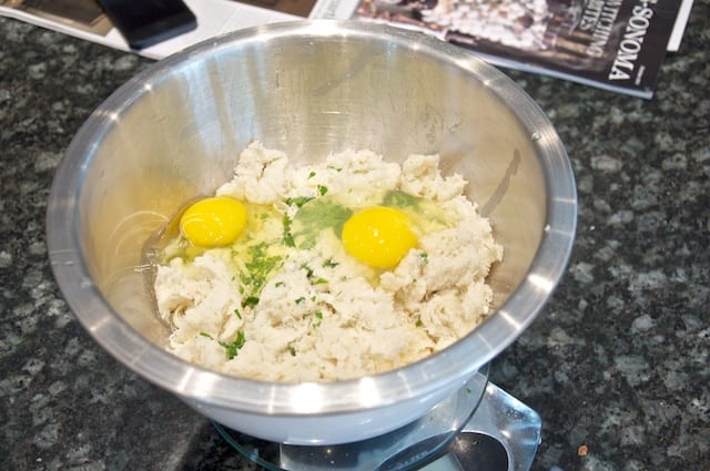 Recipes for pallotte cacio e uova typically call for a mixture of sharp, aged and milder, semi-aged cheeses, and cow’s and sheep’s milk cheeses. The local pecorino abruzzese, of the relatively mild semi-aged variety, is de rigueur. A typical mixture might include 200g of pecorino abruzzese, 100g of Parmesan or grana, and 100g of a sharper fully aged pecorino, like pecorino romano. If you can’t find pecorino abruzzese, which is awfully hard to find outside Italy, the much easier to find pecorino toscano can substitute nicely. I wouldn’t sweat the cheeese too much—remember, this is a poor man’s dish, invented as a way of using up scraps of cheese, so you can do the same. Hey, I even read one online recipe by an ex pat abruzzese living in the UK who likes to add Cheddar to her pallotte cacio e uova.