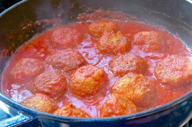 Transfer the fried balls to the tomato sauce and let them simmer there for a good 15-20 minutes. The balls will swell a bit as they cook and take on an almost spongy texture.