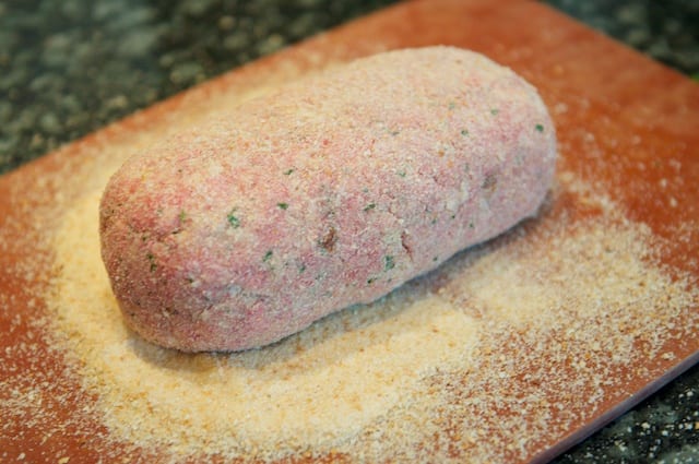 Form the mixture into a compact, elongated loaf, trying your best to eliminate any creases in the loaf. Then roll it in the dried breadcrumbs until the loaf is totally covered.