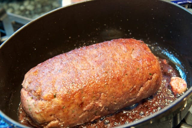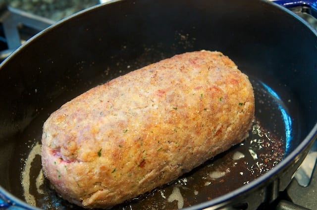You will notice that I have been a bit loose with the measurements for the meatloaf mixture. That’s because exact amount do not matter all that much. Obviously, more bread means a softer loaf. The main thing is to make sure you form a compact loaf that will stick together as you turn it over in the pot—make sure you press the loaf together firmly, ironing out any creases with your hands. After the initial browning, there is no need to turn the loaf, but do move it around from time to time, to prevent the bottom from sticking to the pot and burning.