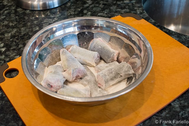 Rinse the eel pieces very well and pat dry with paper towels. Roll the eels in flour, seasoned with salt and pepper, and shake off any excess.