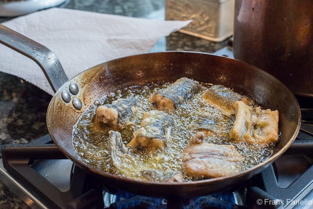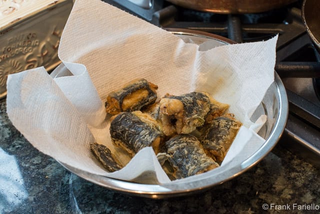 If you’re in the US, I would heartily recommend Wondra flour for frying seafood; it produces a thin and wonderfully crispy crust. The best oil in my opinion for shallow-frying capitone is olive oil, which gives a nice, rich flavor to your fried eel. Make sure you have enough oil in the pan to come at least halfway up the sides of the pieces so they fry on all sides.