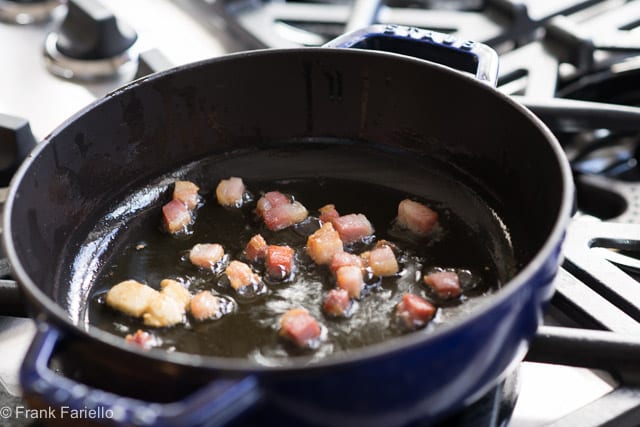 - While the bucatini are cooking, sauté the guanciale or pancetta, in a bit of olive oil (or lard) until the fat is translucent and just beginning to brown slightly. (You are not looking to crisp the pancetta, just to draw the flavor and fat from it and add just a bit of caramelization for added flavor.) If you like, you can add the onion or garlic along with the pancetta; if using garlic, remove it as soon as it begins to color. I also like to add a peperoncino for a little heat, but don't overdo it—this is not meant to be a spicy dish.