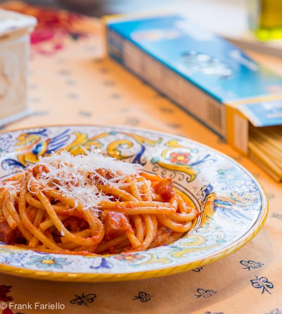 By the way, you will sometimes find bucatini all’amatriciana misspelled as bucatini alla matriciana. This misspelling is said to have been due to the tendency to clip initial vowels in Roman dialect.