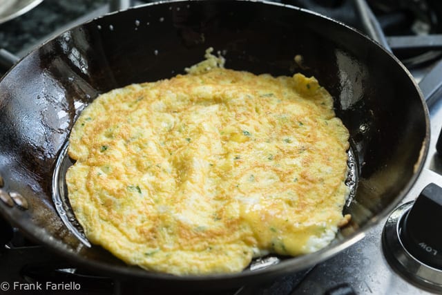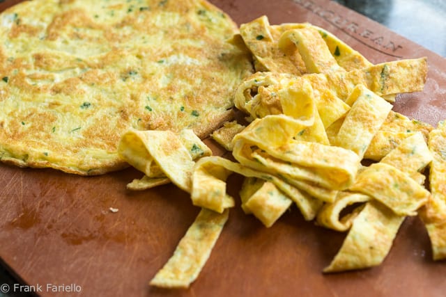 One other small variation among recipes is whether or not to add cheese to the egg mixture. I do, but some recipes reserve the use of cheese for later, either to mix into the dish along with the egg strips at the end or as a topping. And then there’s the choice of cheese, which seems to vary by region: Parmesan in Tuscany, pecorino in Lazio.