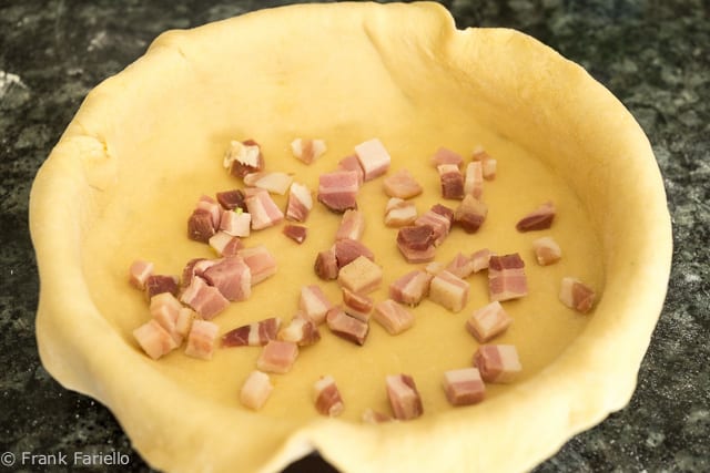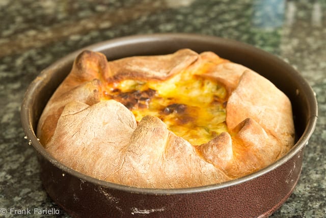 Sprinkle the pancetta over the bottom of the mold, then pour over the leek and egg mixture, using a spatula to spread it evenly on top of the pancetta. Now fold the ends of the dough back over the filling. (Bugialli tells you to trim the dough so it is perfectly round, but as you can see, I didn’t bother. I rather liked the rustic, quirky appearance.)