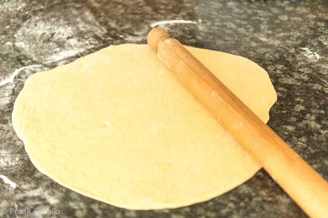 After the dough has rested, lay it on a well-floured surface, flatten it with a few bangs of your rolling pin, then roll it out into a thin disk.