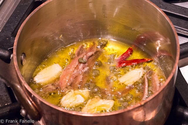 - Meanwhile, in a small pot, sauté the garlic and peperoncino very gently in the olive oil. The heat should be as low as you can manage, so that the garlic and peperoncino steep more than they cook in the oil. When the garlic is slightly brown, add the anchovies and capers and continue to cook very gently, until the anchovies have fallen apart. Add a splash of white wine or water; you will see the anchovies instantly dissolve. Turn off the heat and add most of the chopped parsley. Keep warm, covered, until you're ready to use.