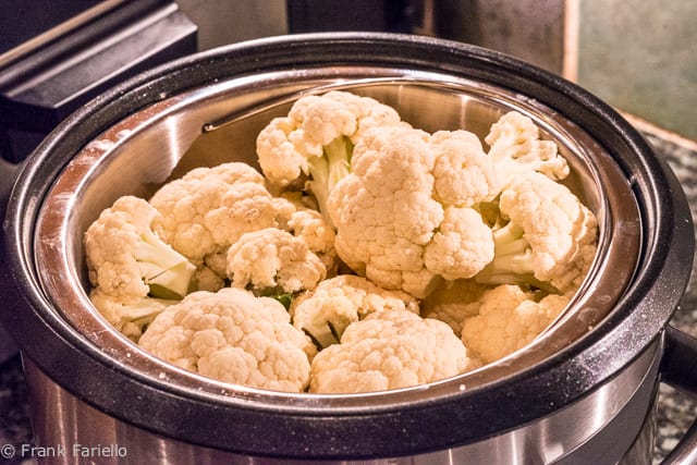 - Put the cauliflower flowerets in a steamer, season with salt, and steam until just tender, about 10-15 minutes depending on the size and age of the vegetable.