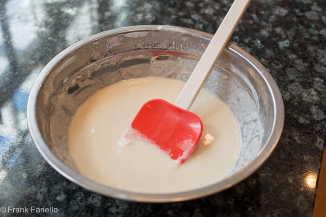 - Make the batter first by mixing the flour, salt and olive oil in a bowl. Add enough water to make a very liquid batter, about the consistency of heavy cream. Let the batter sit for an hour or more.