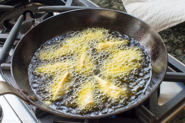When you ready to fry, pour lots of olive oil in a skillet, enough to come up at least 3 cm (1 in) up the sides. Heat the oil until quite hot.