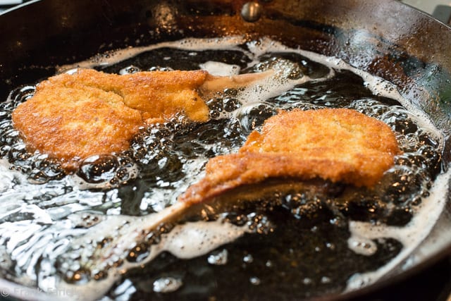 Add olive oil to a skillet so it is about 1 cm (1/3 inch) deep, so that the oil can bubble up around the sides of the chops. They should not, however, ‘deep’ fry. Heat the oil until it is moderately hot and add the chops. Fry them gently until they are nice and golden brown on each side. Make sure the oil is only moderately hot, so they have time to cook inside.