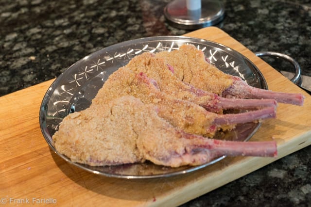 Now you’re ready to proceed with the recipe. The flattening is important, as thinner chops cook more quickly and you’ll avoid the problem of your breading browning before the inside of your chop is fully cooked. (Italians, by the way, generally don’t eat their lamb pink in the middle like the French do; they prefer it fully cooked through.)