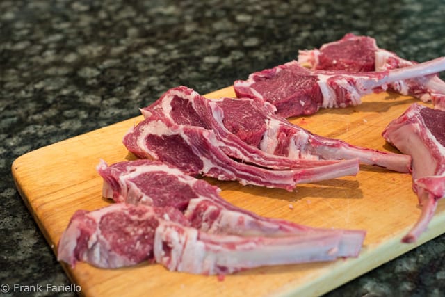 Costolette d’abbacchio are always made with rib lamb chops. The chops are often “Frenched”, with is to say that the bone is trimmed of meat and fat so it can be used as a ‘handle’ when you eat them. For this dish, you also need to make sure that you trim off as much of the fat as you can from the rest of the cut. I usually leave the fat on when grilling or roasting lamb or any kind of meat, since it helps keep the meat moist and flavorful as it renders. For this dish, however, since the fat is not in direct contact with the heat source, it won’t render out. Trust me, it makes for less than pleasant eating—and I love my fat.